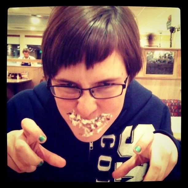 When ever I want anything done with my hair my instinct is to call Anita, so that's exactly what I did. Within moments after the phone call I was walking up the hill to her house. She trimmed my hair quite nicely and quickly so I looked a little more like a lady and not a British man. But the challenge came when she tried to cut my bangs. Not being used to cutting short female hair/bangs she tried her best with her inexperienced ways (in that certain element of hair). Through out that night between IHop, bowling, coffee shops and late night talking, she would experiment with any dull scissors she could get her hands on. As the night went on my bangs just got shorter and shorter and worse and worse. But I just embraced them for they were reminder of all the fun I had that night! I would much rather have ugly bangs then professional ones with no stories.